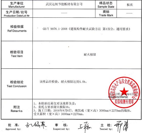 從表中可以看出,最高的耐火要求是3小時(shí),那達(dá)權(quán)輕質(zhì)隔墻板的耐火極限可以達(dá)到多少,先給大家展示一下達(dá)權(quán)輕質(zhì)隔墻板的耐火極限檢測(cè)報(bào)告。