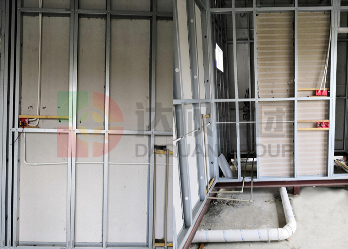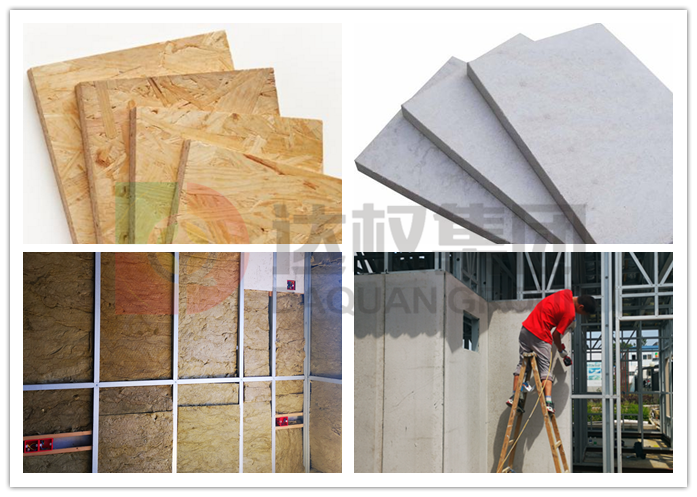 3、墻面安裝:內(nèi)外墻采用OSB板與硅酸鈣板,中間填充保溫巖棉等材料,板與龍骨使用鋼釘固定。